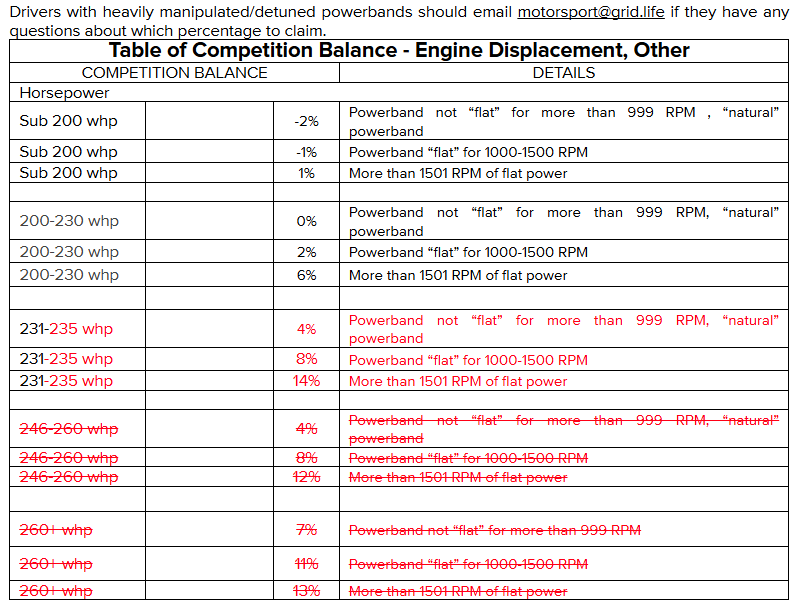In a baffling move, they've tripled down on the "bracket" method, which aims to create "parity" across the 12.5:1 power-to-weight ratio class. They have outright banned anything above 235whp, severely de-incentivized running above 230whp (there is a 4% penalty for each additional horsepower above 230whp), and imposed heavier-than-ever penalties for being "flat tuned for more than 1,500 rpm."
