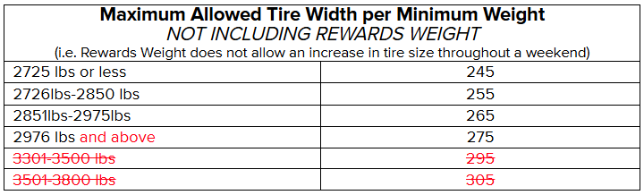 First, they did nothing to prevent cars weighing well under 2,725lbs from running up to a 245-width average. For example, a 2,400lb front wheel drive car can legally run 265 front tires and 225 rear tires, which is a clear advantage for the few cars that can benefit from its exploitation.