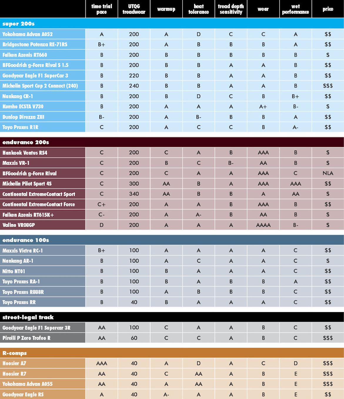 Today's crop of "200tw" tires are seriously impressive. I would guess that most HPDE drivers are using something in the endurance 200 or super 200 category, as per GRM's "Ultimate Track Tire Guide" (chart below). Most of these tires are capable of outpacing the racing slick tires from a decade or two ago.